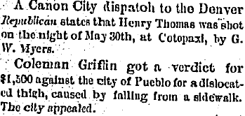 1/14/2016 Jen Low adds: Gold Tom had recently bought Saltiel's holdings at a Sheriff's sale. Saltiel had been absent from Cotopaxi for quite a spell, and had returned on May, 30, 1884....the same day God Tom was shot. 2 weeks later the Sheriff gave it all back to Saltiel!